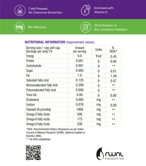 Researched Omega-3 molecule derived from plant source and capsuled in plant source sofgel capsules very essential for heart, brain, eyes, joints, neural and hormonal health.